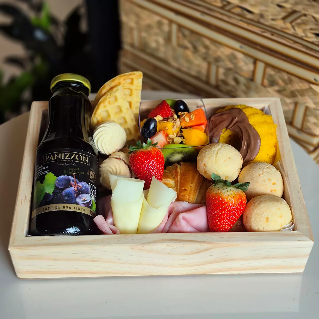 Suco integral, Dripp coffee, Croissant amanteigado, Pães de queijo,